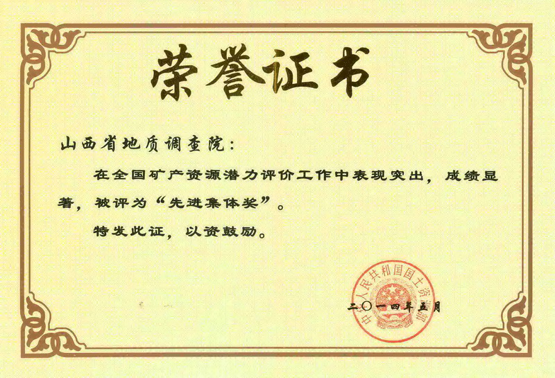 研究院始終堅持“質量第一,誠信為本,勇于創新”的宗旨,原始資料及成果報告優良率100%,優秀率達75%。完成的西藏1∶25萬土則崗日幅、山西1∶25萬忻州市幅區域地質調查獲國土資源部科學技術二等獎;在全國優秀圖幅展評中1∶25萬忻州市幅獲一等獎,1∶25萬托和平錯、應縣幅及1∶5萬御棗口幅獲二等獎,1∶25萬岢嵐縣幅、臨汾市幅、侯馬市幅等6個項目獲三等獎,其中1∶25萬、應縣幅、岢嵐縣幅、侯馬市幅獲中國地質調查成果二等獎。